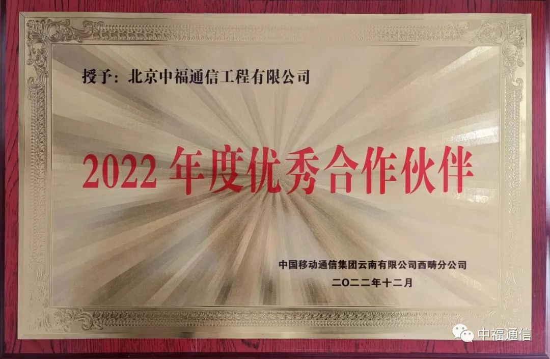 202212月,文山項(xiàng)目部在202212月獲得了中國(guó)移動(dòng)通信集團(tuán)云南有限公司西疇分公司及中國(guó)移動(dòng)通信集團(tuán)云南有限公司廣南分公司頒發(fā)的“2022年度優(yōu)秀合作伙伴”獎(jiǎng)牌。
