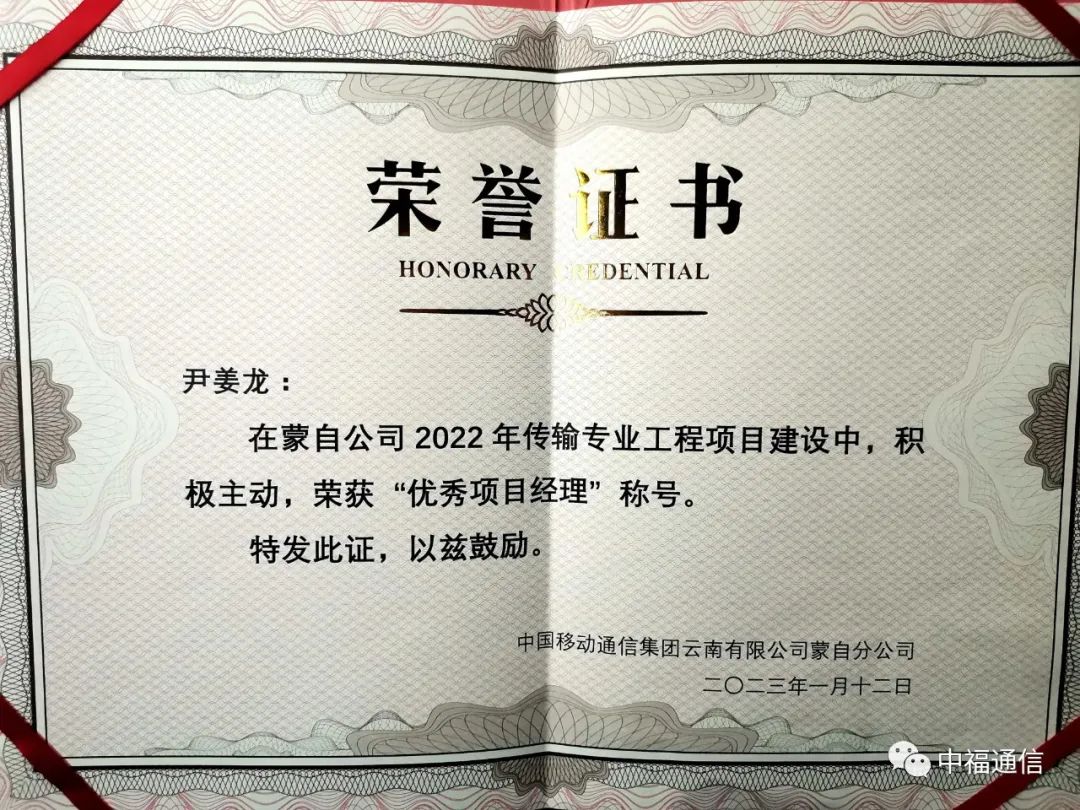 紅河項(xiàng)目部尹姜龍?jiān)?/span>20231月獲得中國(guó)移動(dòng)通信集團(tuán)云南有限公司蒙自分公司“優(yōu)秀項(xiàng)目經(jīng)理”稱號(hào)。